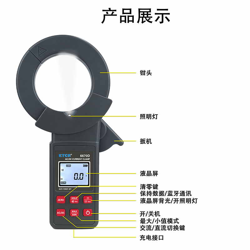 ETCR6670D大口徑直流/交流鉗形電流表鉗表具有直流/交流真有效值測量、最大值/最小值/平均值測量等功能。鉗表具有數(shù)據(jù)保持、藍牙通訊功能,使用大容量鋰電池type-c充電口,是一款新型的電工安全檢測必備工具。