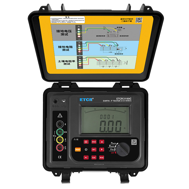 ETCR3100C接地電阻·土壤電阻率測(cè)試儀由主機(jī)、監(jiān)控軟件、測(cè)試線、輔助接地棒、通訊線等組成。主機(jī)超大LCD顯示,白屏背光,棒圖指示,一目了然。儀表具有報(bào)警功能,可設(shè)置報(bào)警閾值,具有數(shù)據(jù)存儲(chǔ)功能存儲(chǔ)400組數(shù)據(jù),藍(lán)牙通信功能,安裝APP可在移動(dòng)終端查看測(cè)試數(shù)據(jù),USB通信功能,安裝上位機(jī)軟件后可將測(cè)試記錄下載電腦保存、分析、打印。