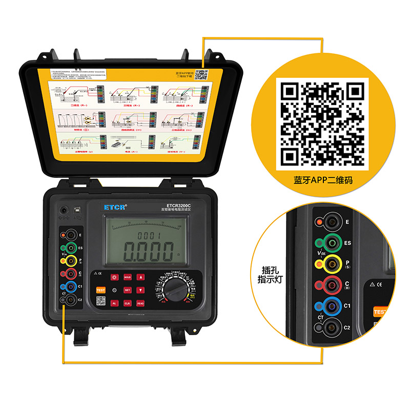 ETCR3200C雙鉗多功能接地電阻測試儀由主機、電流鉗(雙鉗)、測試線、輔助接地棒、通訊軟件、通訊線等組成。主機超大LCD顯示,具有背光、棒圖指示,一目了然。儀表具有存儲功能,時鐘功能,自動存儲含有時間的測試結(jié)果2000組。儀表具有支持安卓系統(tǒng)的藍牙通信功能,安裝APP后可在移動終端進行測試或讀取測試記錄,給你帶來全新體驗。儀表具有USB通信,存儲數(shù)據(jù)通過USB接口上傳PC機,通訊軟件可以實現(xiàn)歷史記錄數(shù)據(jù)讀取、查閱、保存、報表、打印等功能。儀表廣泛應(yīng)用于電力、電信、氣象、油田、建筑、防雷及工業(yè)電氣設(shè)備等行業(yè)。
