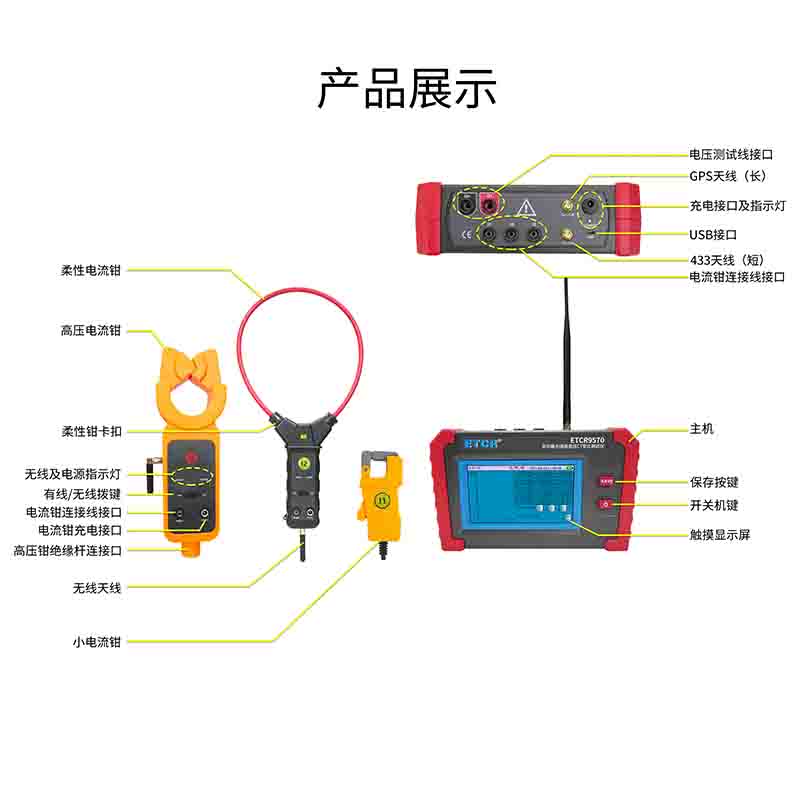 ETCR9570多功能無線高壓CT變比測試儀又稱互感器電流變比測試儀、互感器比差測試儀、電流互感器變比測試儀,用于35kV以下電流互感器的一次電流、二次電流大小、變比、角差,相別、極性判斷。儀器還能測量電力系統(tǒng)的電壓、電流、漏電流、相位、頻率、有功功率、無功功率、功率因數(shù)、諧波等電力參數(shù),還能顯示電壓、電流的波形,交流信號的諧波含有率和波形畸變率。廣泛應用于變電站﹑發(fā)電廠﹑電力稽查部門、工礦企業(yè)以及檢測站﹑電工維修部門進行電流檢測、反竊電及野外電工作業(yè)等。