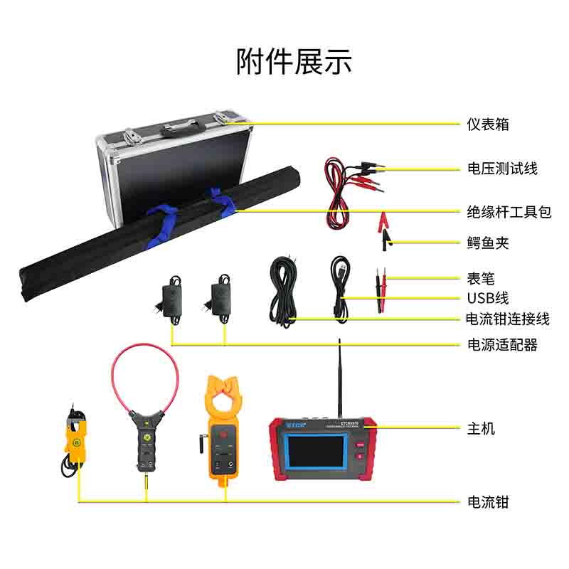 ETCR9500B無線高壓CT變比測試儀由手持終端、小電流鉗、柔性電流鉗、高壓電流鉗、測試線、高壓絕緣桿、上位機軟件等組成,高壓電流鉗采用高性能坡莫合金制作,測試精度高。手持終端采用5寸觸摸彩屏,中文界面,所有測試結(jié)果同屏顯示。高壓鉗具有獨特的自動插拔結(jié)構(gòu),通過按壓或退拔絕緣桿能方便鉗夾或撤離被測導線,操作安全省時快捷。柔性電流鉗輕巧細小,適合空間狹小場所(如配電柜內(nèi)的母排等)。儀器具有有線或無線兩種測量模式,可應對各種測試場所,無線測試模式傳輸距離達40米。絕緣桿輕便,具有防潮﹑耐高溫﹑抗沖擊﹑抗彎﹑高絕緣特點,絕緣等級110kV。儀表具有存儲功能,USB通信接口,存儲數(shù)據(jù)可上傳電腦進行歷史數(shù)據(jù)讀取、查閱、保存、打印等。